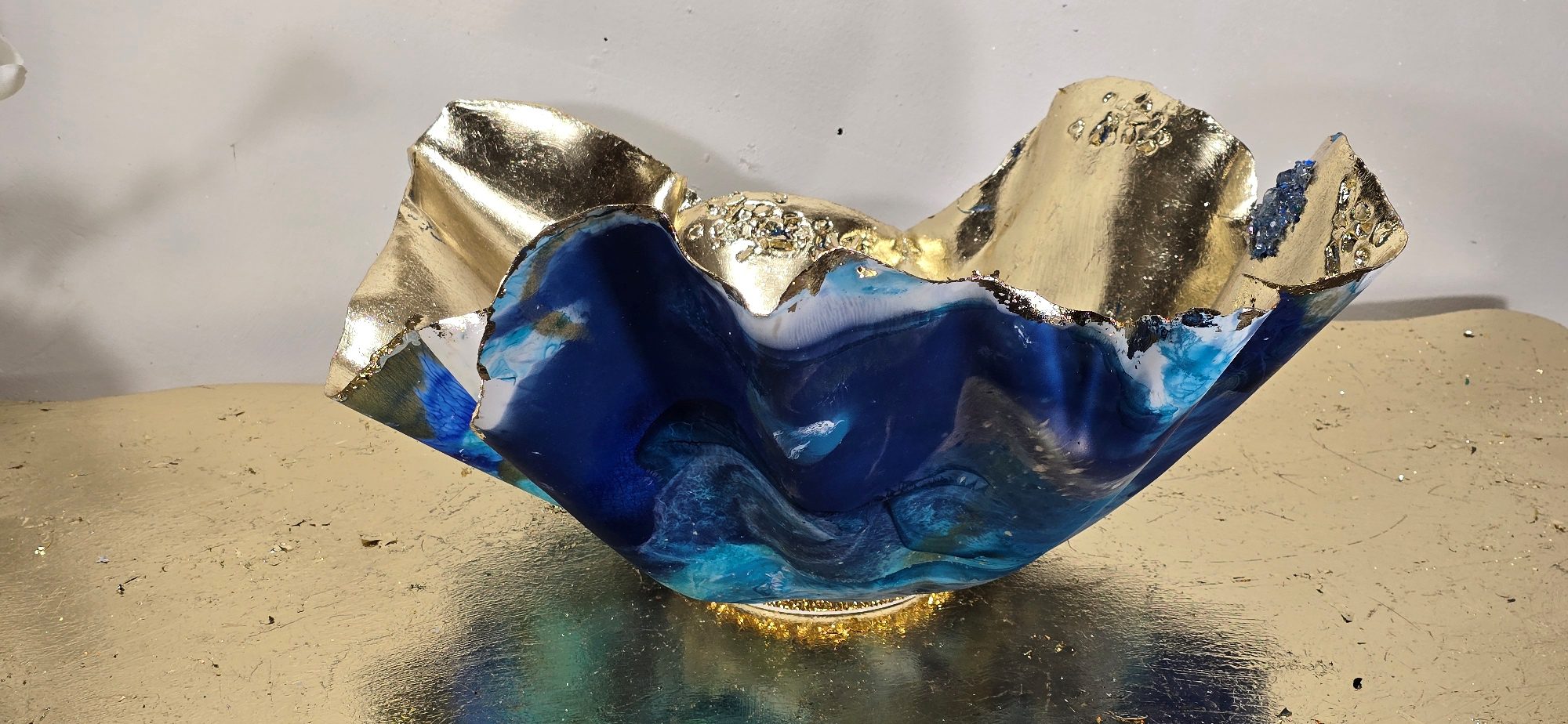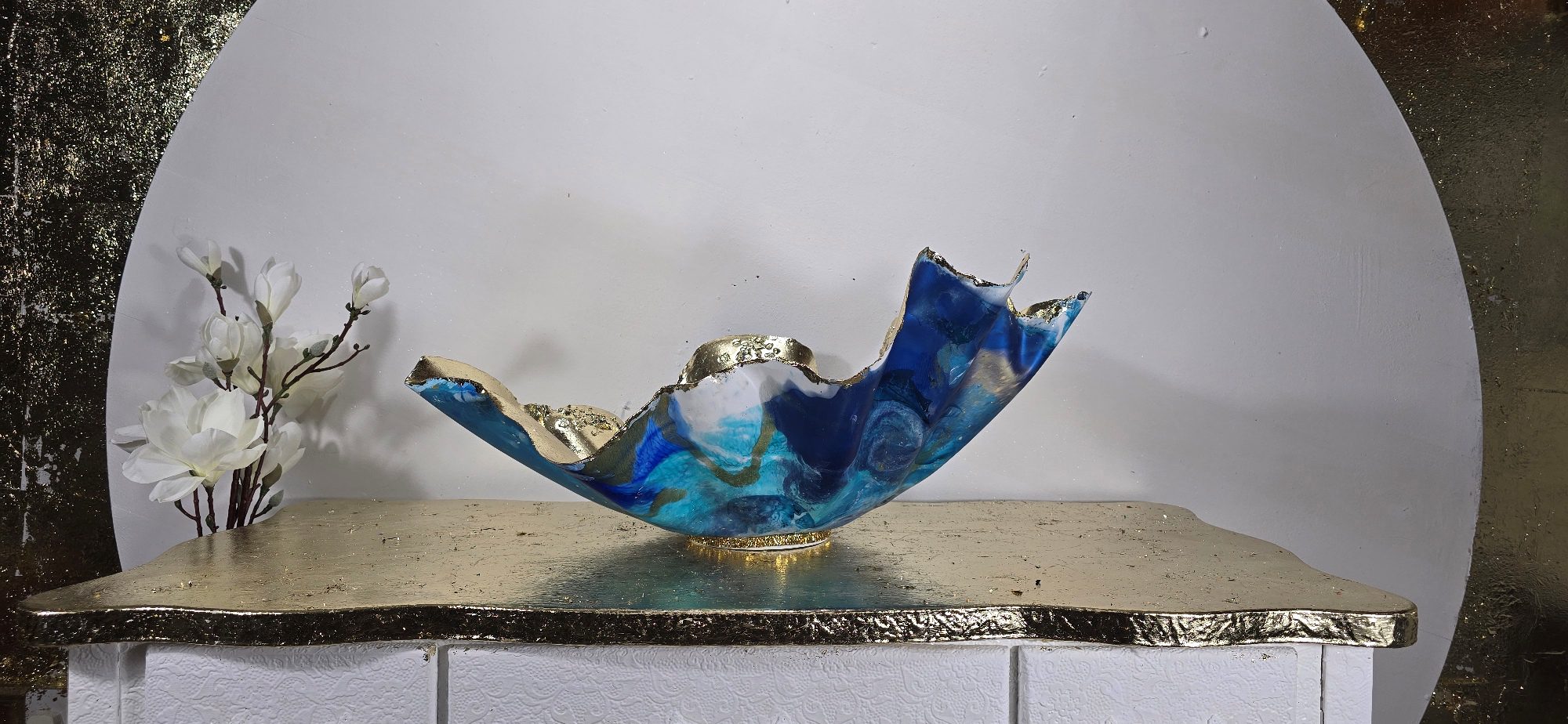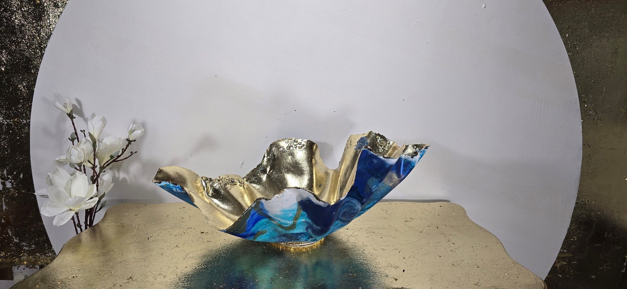 Make a bold statement with this stunning handmade shallow sculpture bowl sits on a small base and is the perfect way for adding a touch of elegance to your coffee table with its combination of beautiful colours and intricate details of gold foil. Colours: A variety of deep blues with just a hint of gold pigments finished with a luxurious metallic gold foil interior. Look closely and you will see unique patterns swirling around the outside. Size: Extra Large/Giant. Features: Versatile Use: Ideal for holding candles, fruit, potpourri, or other decorative items. This bowl is perfect as the finishing touch to your home adding a touch of sophistication.