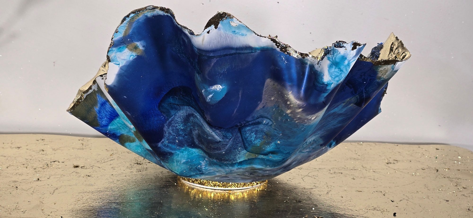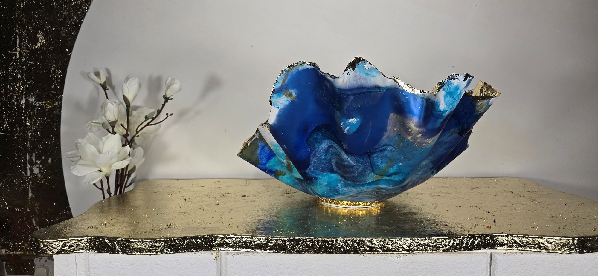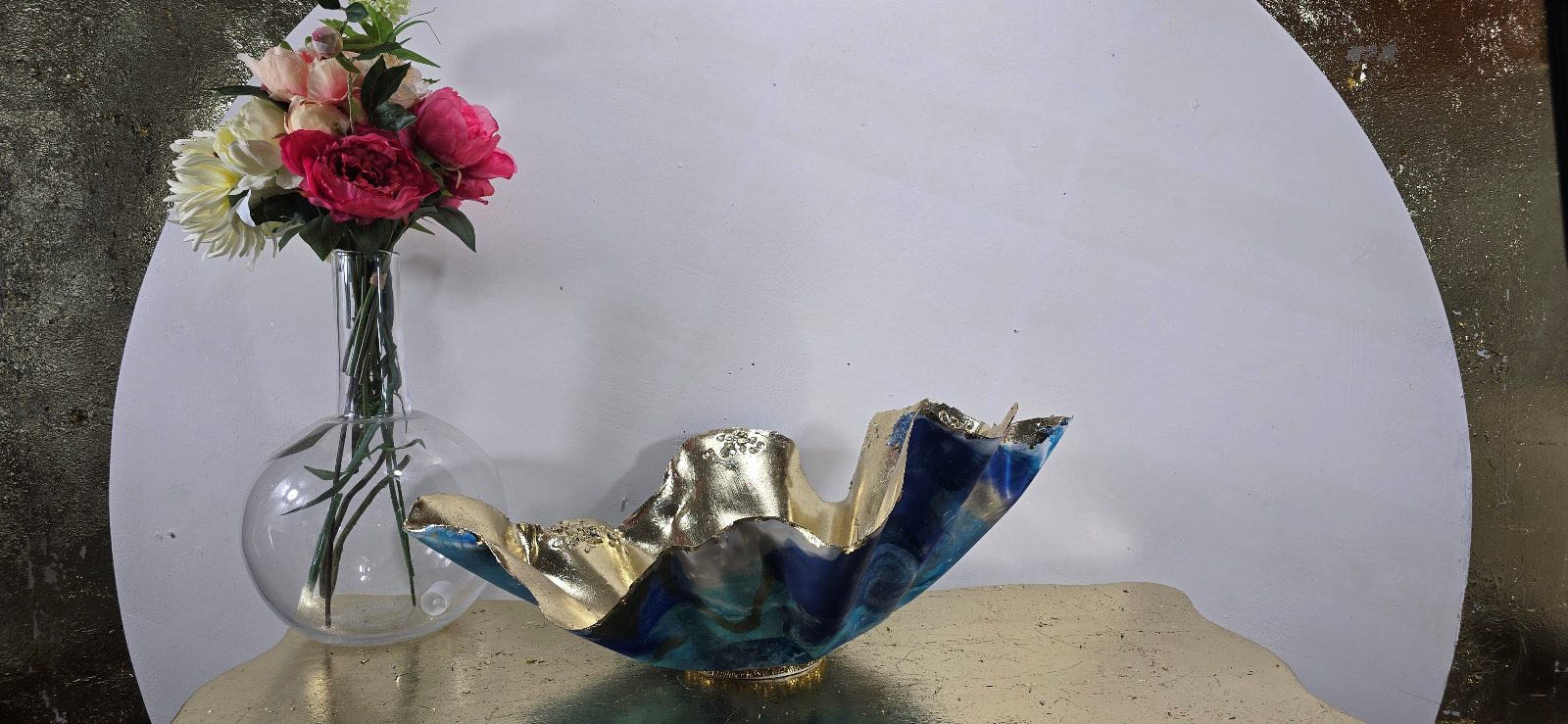 Make a bold statement with this stunning handmade shallow sculpture bowl sits on a small base and is the perfect way for adding a touch of elegance to your coffee table with its combination of beautiful colours and intricate details of gold foil. Colours: A variety of deep blues with just a hint of gold pigments finished with a luxurious metallic gold foil interior. Look closely and you will see unique patterns swirling around the outside. Size: Extra Large/Giant. Features: Versatile Use: Ideal for holding candles, fruit, potpourri, or other decorative items. This bowl is perfect as the finishing touch to your home adding a touch of sophistication.