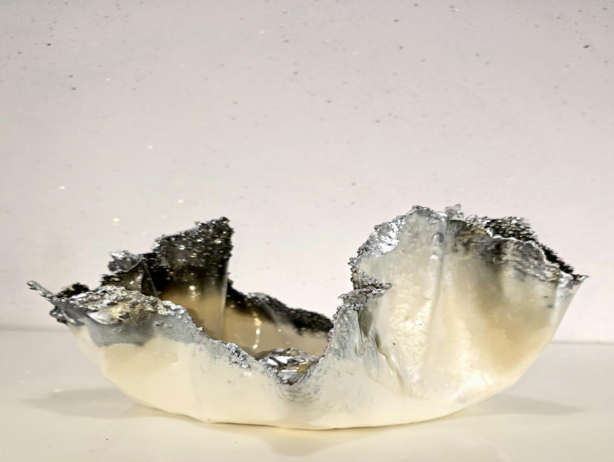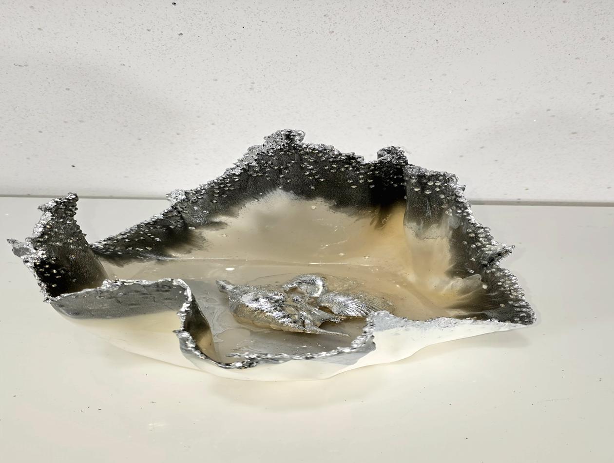 Bring a touch of the ocean to your home with this beautiful handmade bowl. Perfect for reminiscing about holidays, this small to medium-sized bowl features a sleek white base with a gunmetal silver-edged rim. The centrepiece of this bowl is adorned with real shells from India, giving it a unique sea-inspired theme. Colours: white, gunmetal metallic grey. Size: Medium. Features: Elegant Design: White base with a gunmetal silver-edged rim with a Sea-Inspired Theme using real shells from India protruding from the centre. Use: Ideal just as a decorative accent or tea lights to give a subtle glow. A lovely unique piece of art for your home.