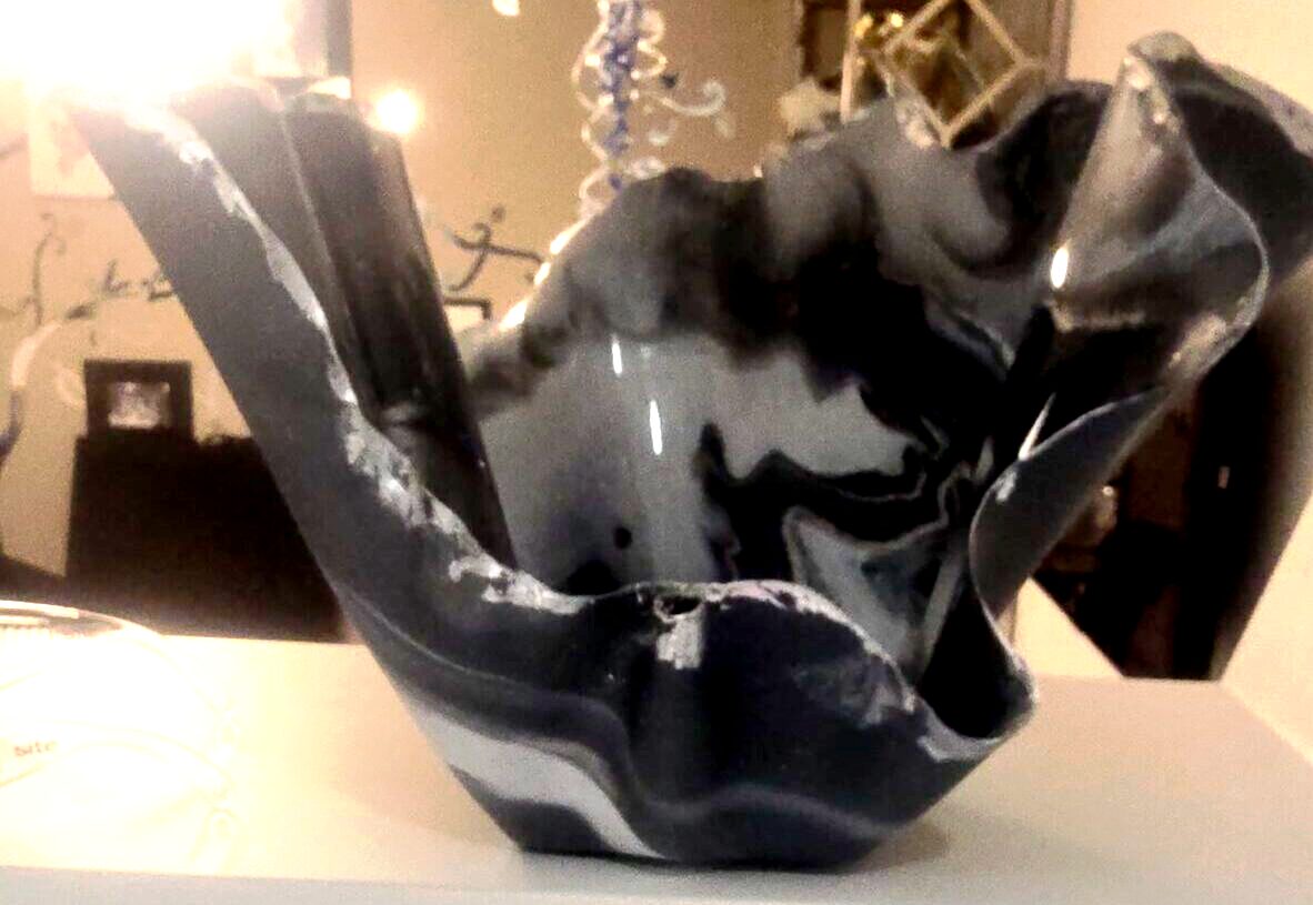 This multi use bowl has 3 full sides and one dipped so as to display its contents. Matt dove grey is the main colour broken up with touches of white and silver. Finished with silver metallic foil. Perfect for candles or infusers or to display fruit.