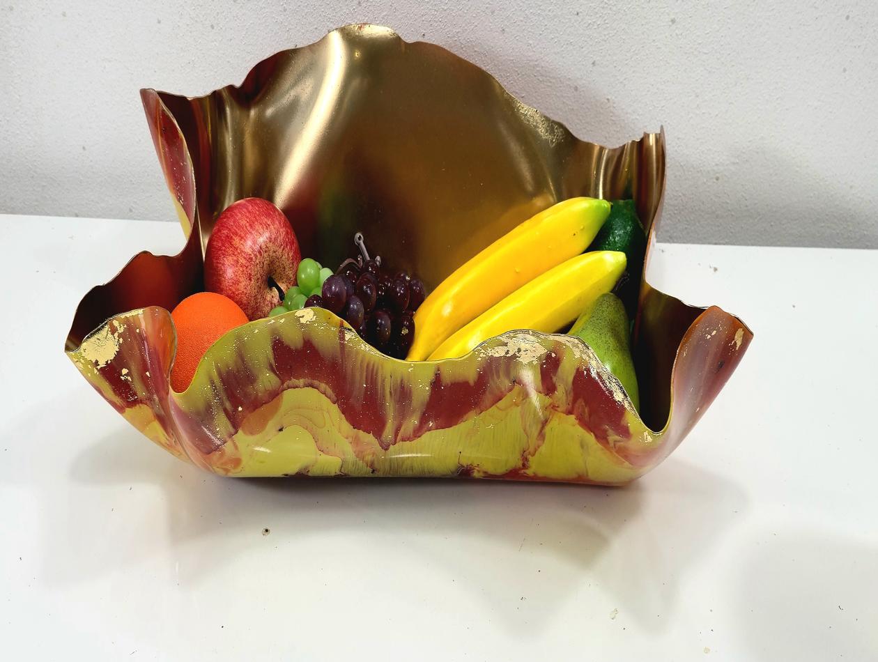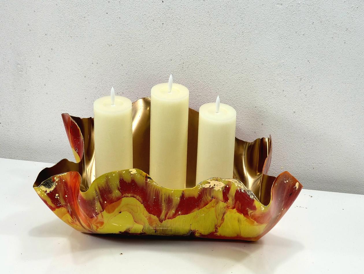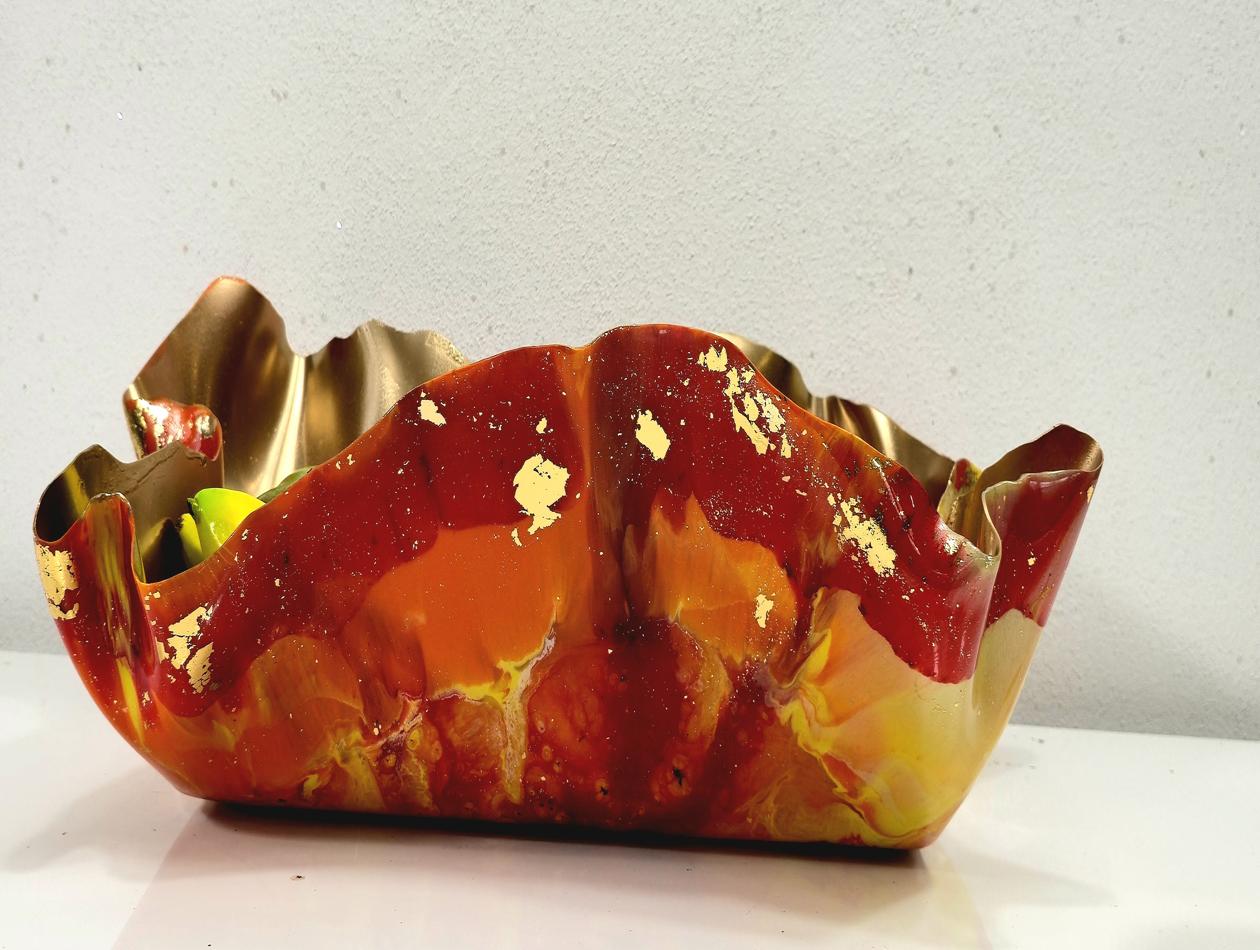 Ignite your home décor with this breathtaking, Firey Striking table centrepiece. Capturing the dynamic energy of a flame, this unique piece uses intense colours and luxurious metallic detail to create an unforgettable focal point. Intense Colour Swirls: The design features powerful swirls of vibrant red, bright orange, and brilliant yellow, blending and colliding like controlled bursts of fire. Luxurious Gold Detail: The interior is finished entirely in a dazzling, reflective gold, ensuring maximum light capture and brilliance. Metallic Edge: The random outer edges are meticulously highlighted with gold metallic foil, adding a rich, handcrafted sparkle that frames the intense colours beautifully. Statement Size: This stunning piece is designed to be large and shallow, making it visually impactful enough to stand alone. This is more than just a bowl; it’s a dramatic, multi-use sculpture that instantly commands attention: