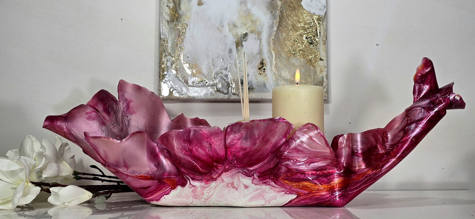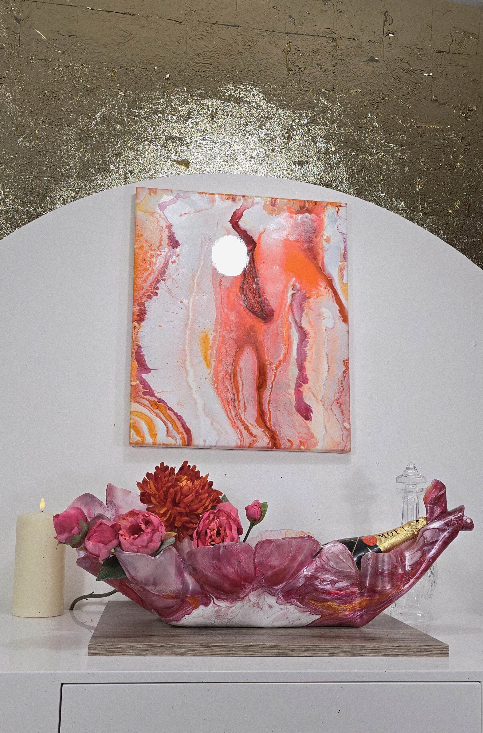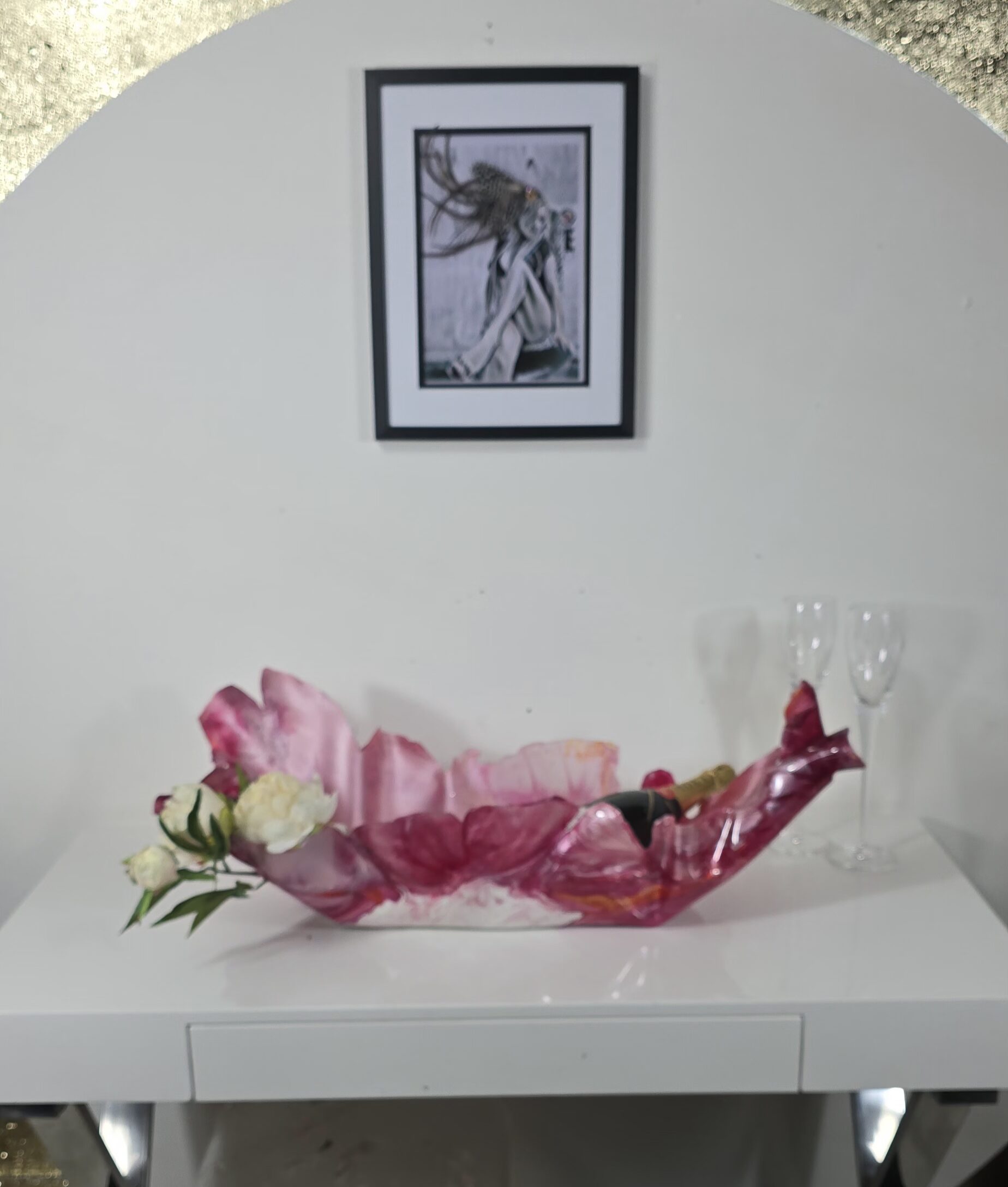Why not display a plant or a large candle making this a multi-use and functioning object of art.Introducing a truly wonderful and unique Multi-Use Oblong Sculpture Bowl, inspired by the beauty of spring flowers. This exquisite oblong flower bowl features a stunning array of pink tones, forming delicate flower shapes throughout the sides. Some elements have been intricately molded to resemble flower buds and twisted designs, adding a sense of movement and elegance to the piece.