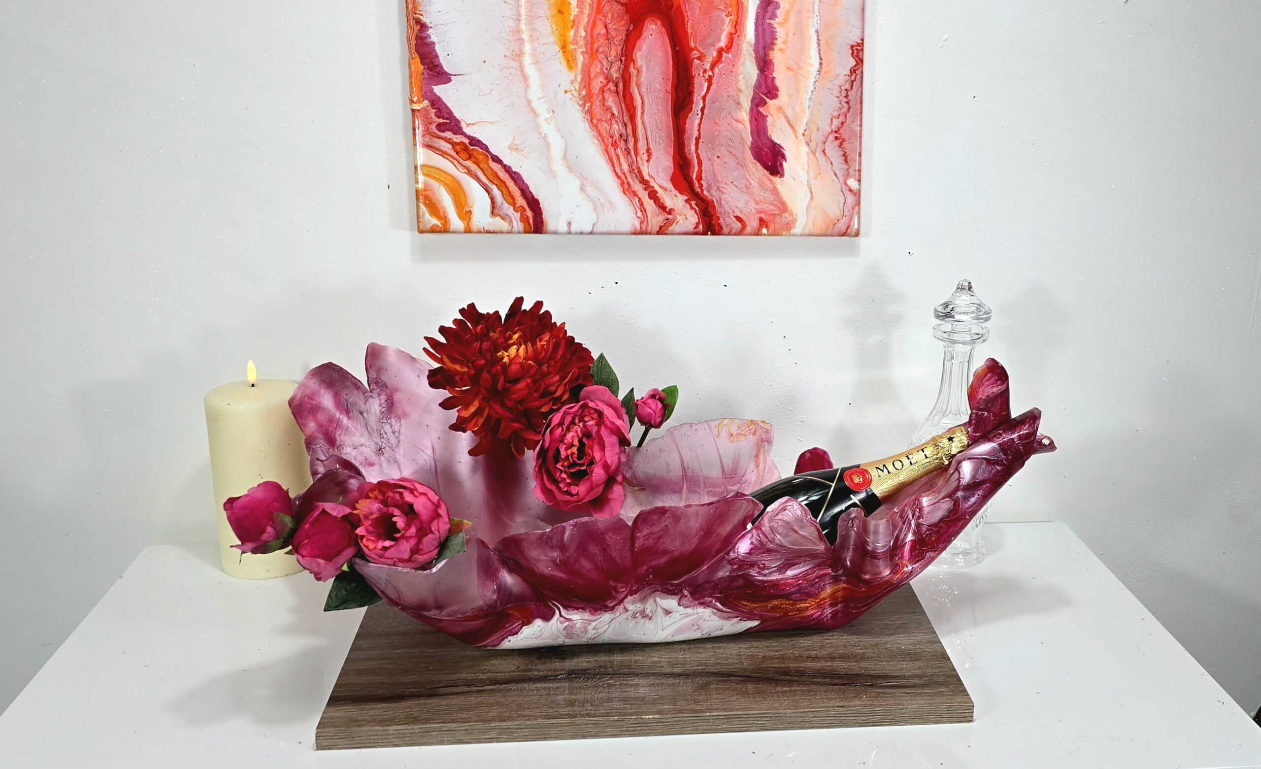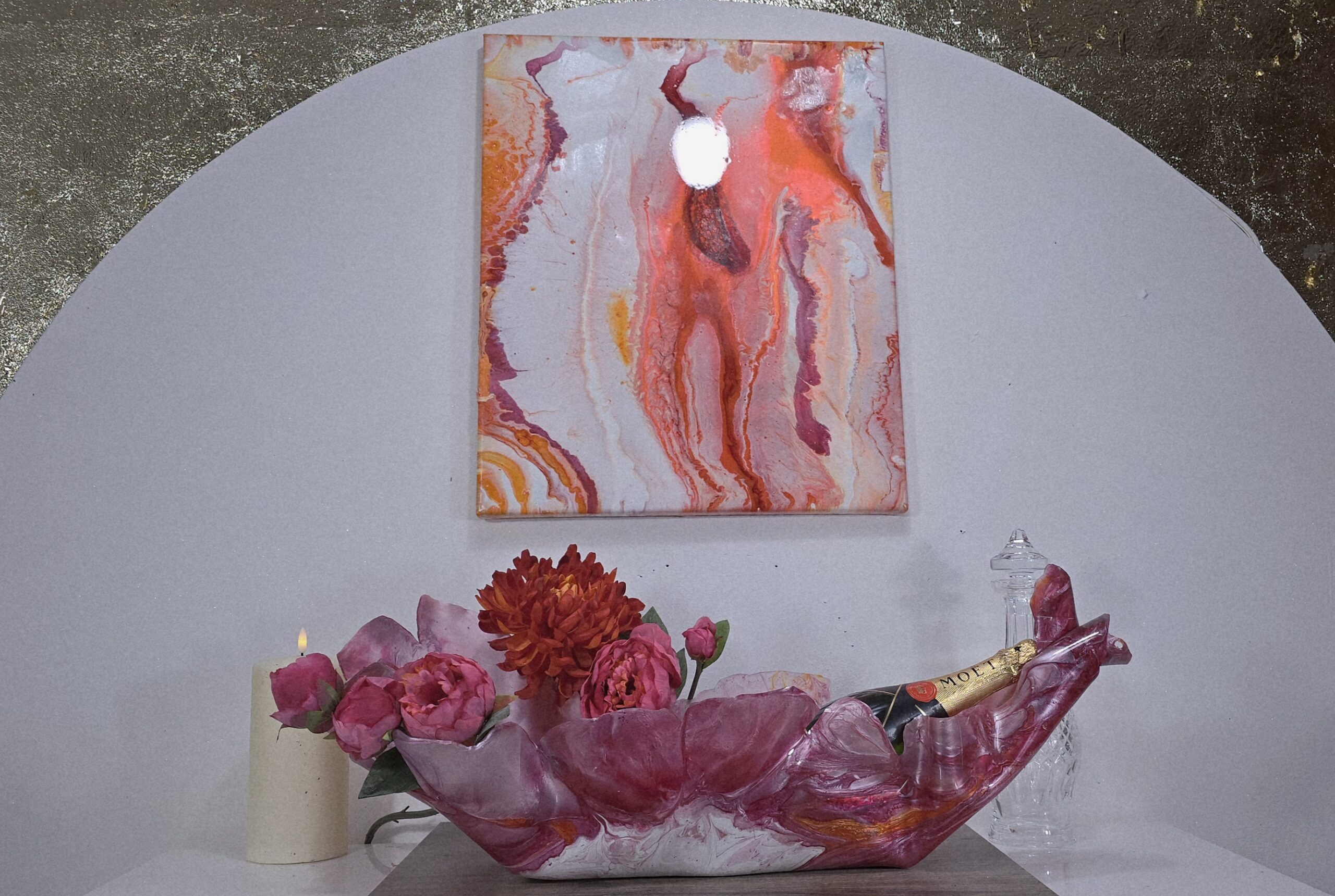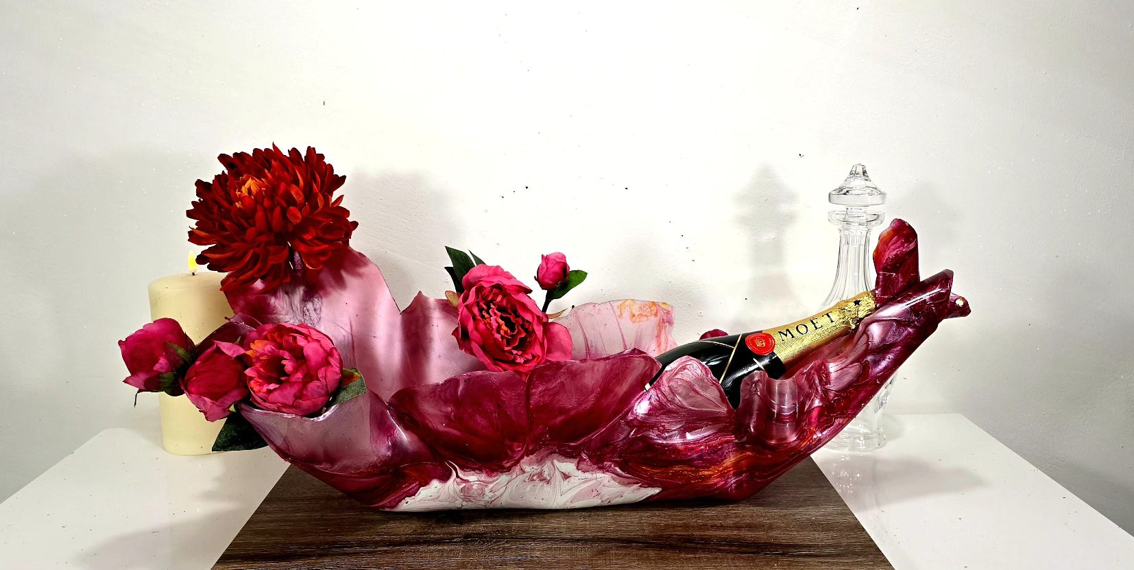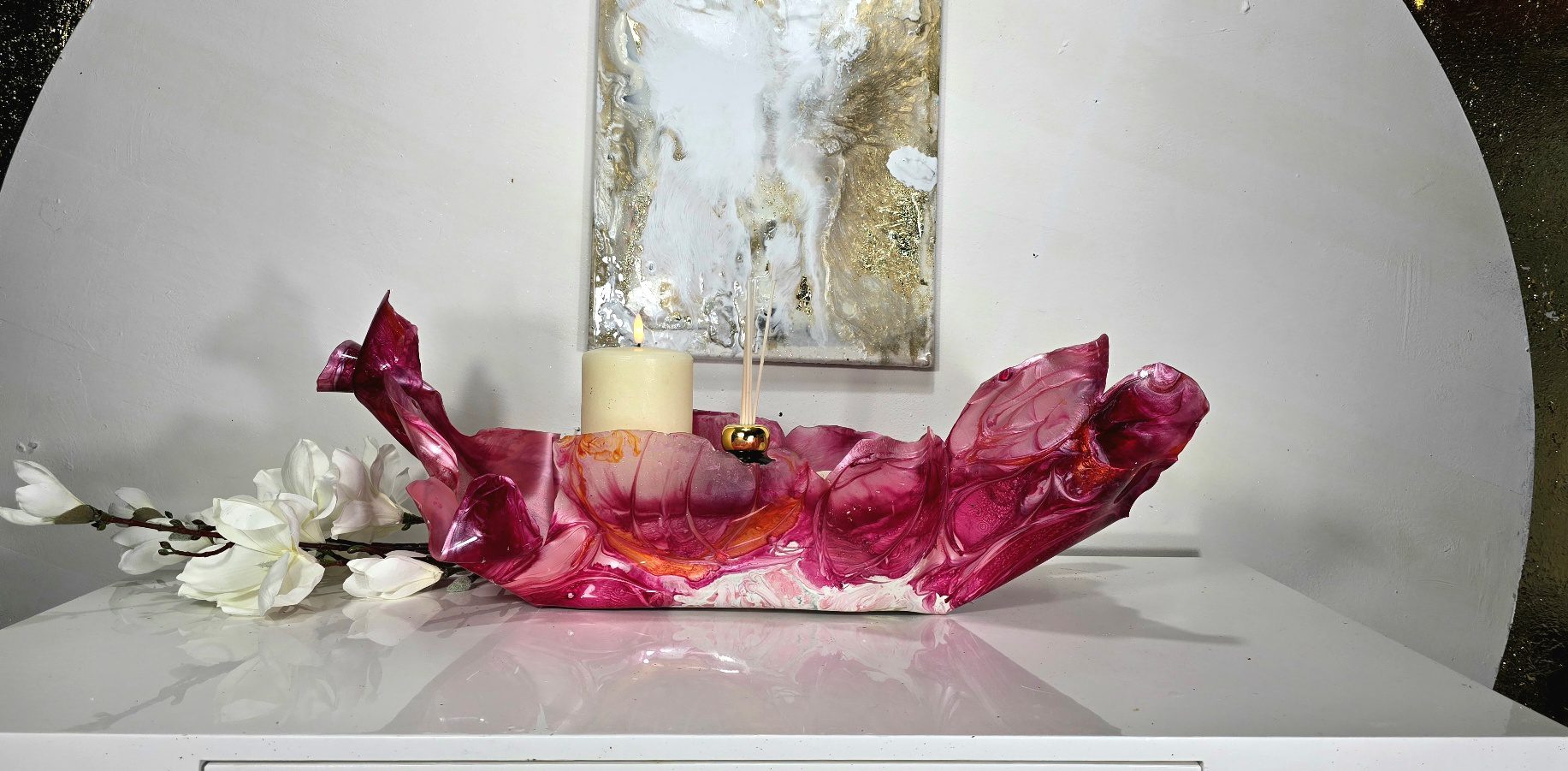 Why not display a plant or a large candle making this a multi-use and functioning object of art.Introducing a truly wonderful and unique Multi-Use Oblong Sculpture Bowl, inspired by the beauty of spring flowers. This exquisite oblong flower bowl features a stunning array of pink tones, forming delicate flower shapes throughout the sides. Some elements have been intricately molded to resemble flower buds and twisted designs, adding a sense of movement and elegance to the piece.
