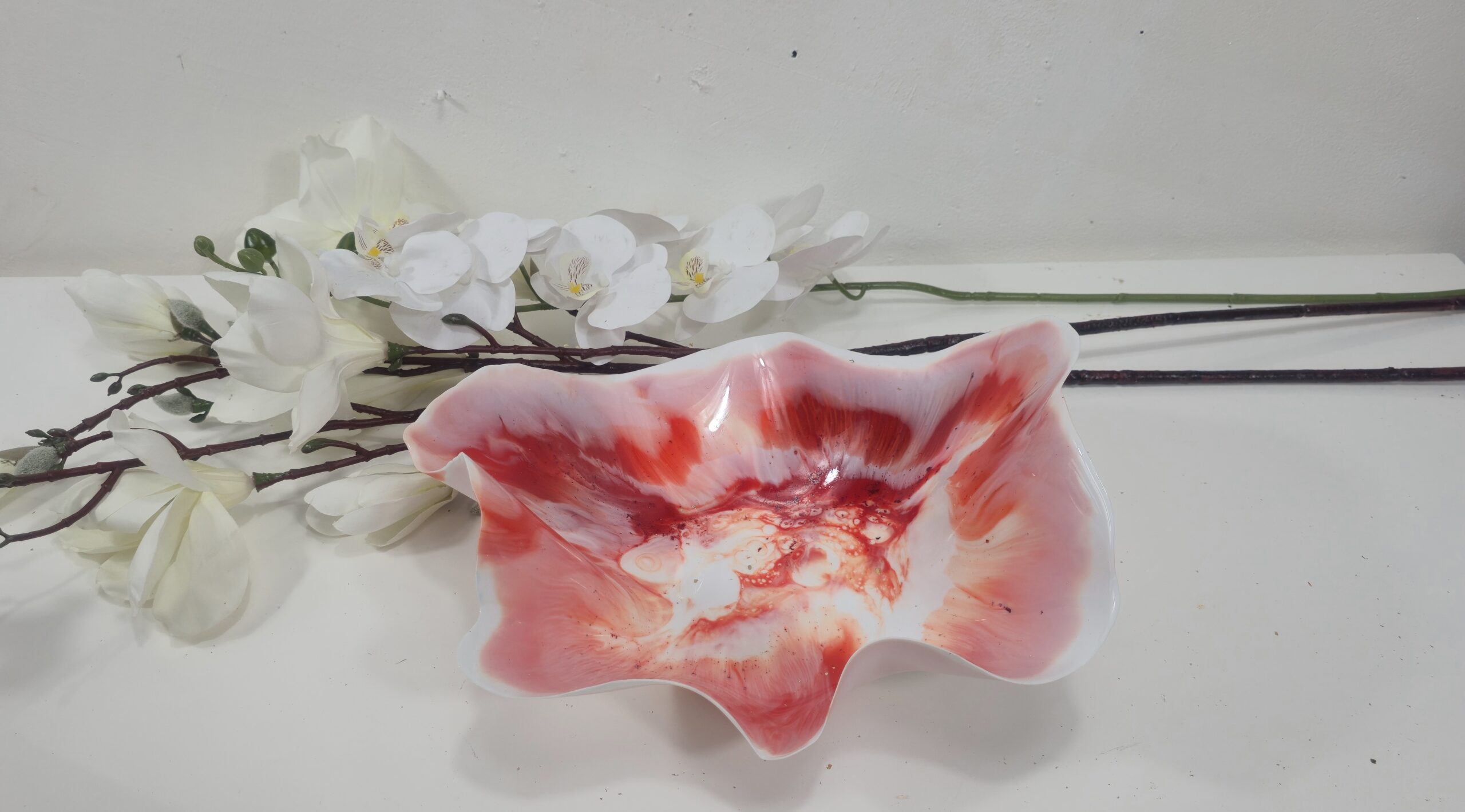Rings of white and reds run through this charming shallow trinket/fruit bowl. Of course it is up to you what you use it for as most of our items are adaptable.