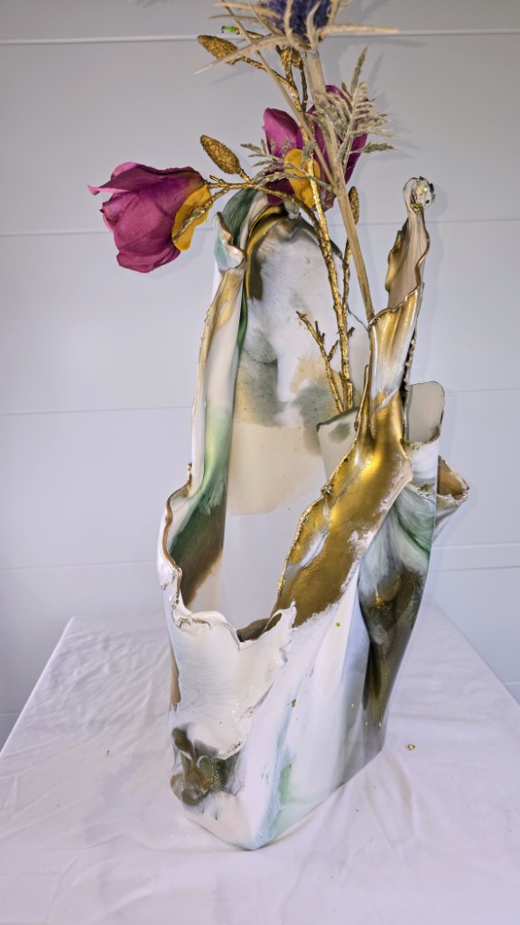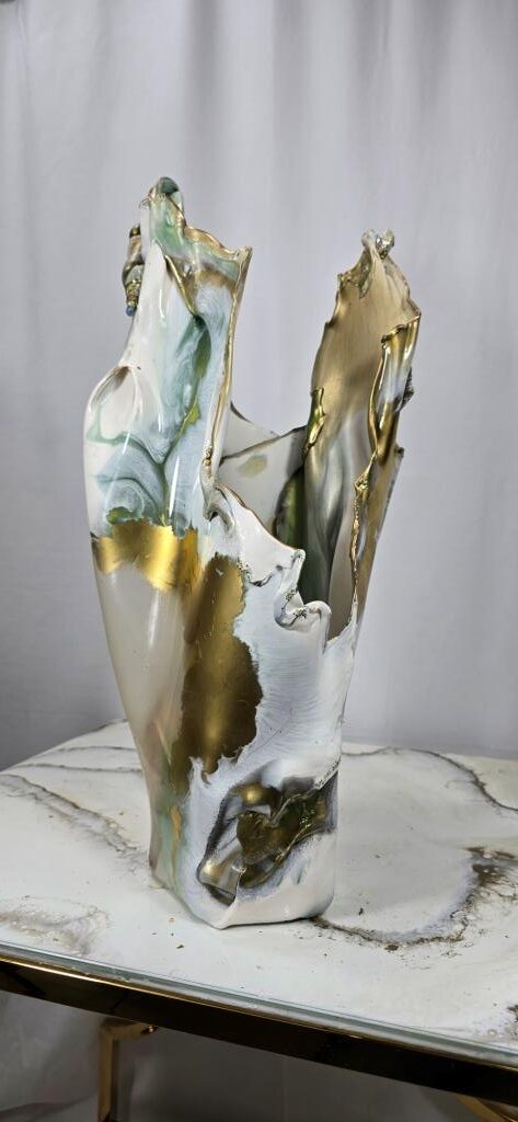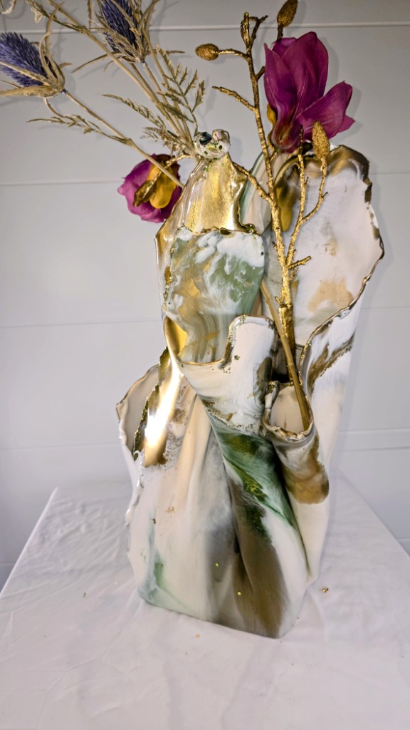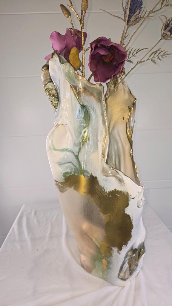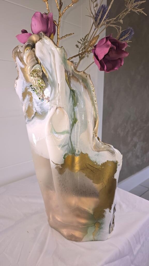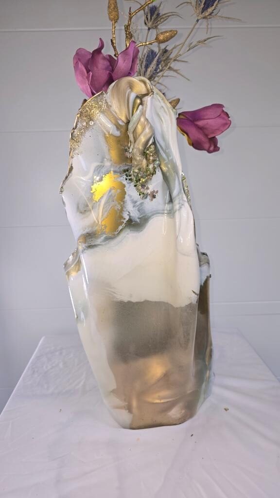 Add a touch of elegance and creativity to your home with this one-of-a-kind vase. A unique ceramic gold plant pot holder shaped like lips is encased in clear resin to showcase the lips, then carrying on in coloured gold and white resin to create a stunning vase shaped piece of art The vase peaks in a twisted finish, adorned with multifaceted gems that catch and reflect light beautifully. Colours: clear, white, gold. Size: Large. Versatile Use: Perfect for displaying fresh or faux flowers, small succulents (note: no drainage at the base). Or why not add fairy or tea lights or an LED candle creating a stunning visual subtle background lighting effect. This is truly a one of a kind unique handcrafted piece. Why not bring a unique and artistic flair to any space with this exquisite vase.