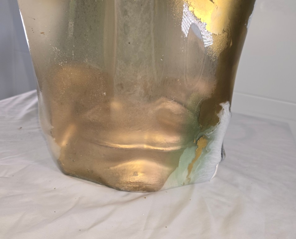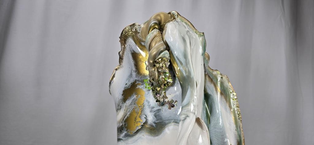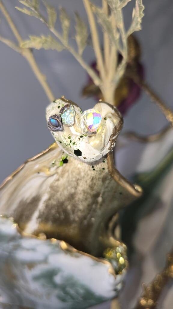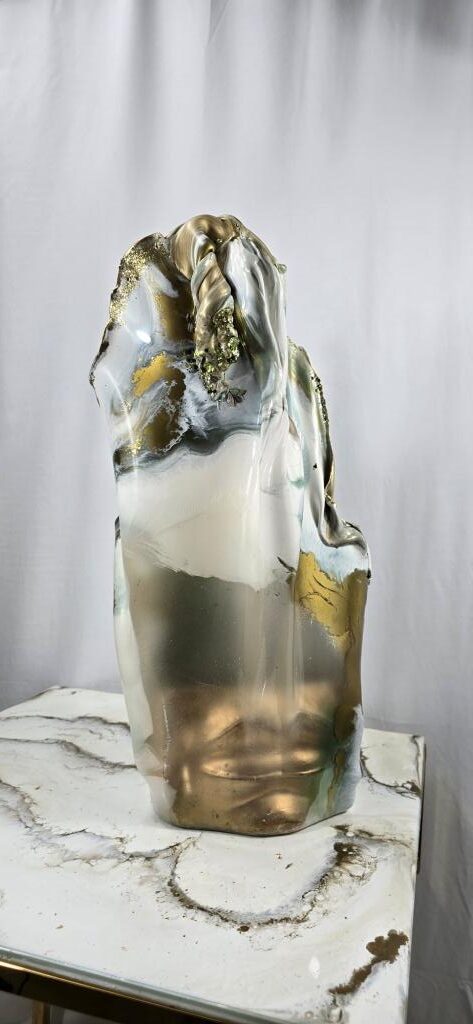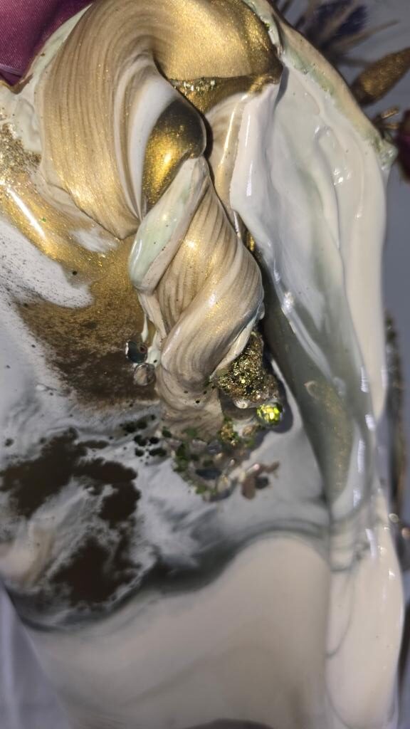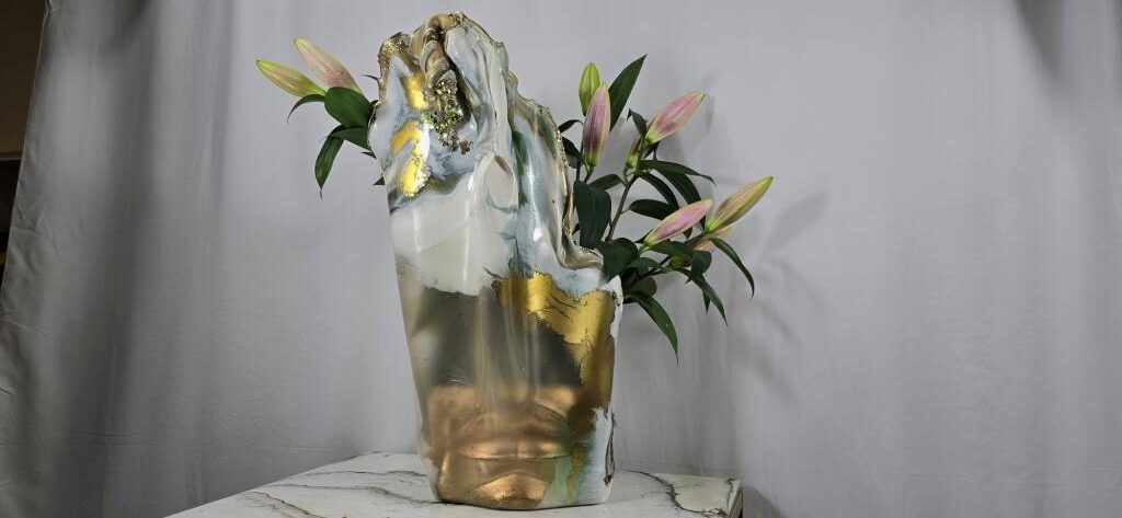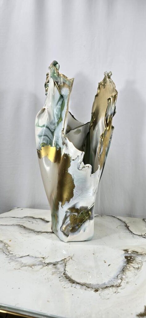 Add a touch of elegance and creativity to your home with this one-of-a-kind vase. A unique ceramic gold plant pot holder shaped like lips is encased in clear resin to showcase the lips, then carrying on in coloured gold and white resin to create a stunning vase shaped piece of art The vase peaks in a twisted finish, adorned with multifaceted gems that catch and reflect light beautifully. Colours: clear, white, gold. Size: Large. Versatile Use: Perfect for displaying fresh or faux flowers, small succulents (note: no drainage at the base). Or why not add fairy or tea lights or an LED candle creating a stunning visual subtle background lighting effect. This is truly a one of a kind unique handcrafted piece. Why not bring a unique and artistic flair to any space with this exquisite vase.